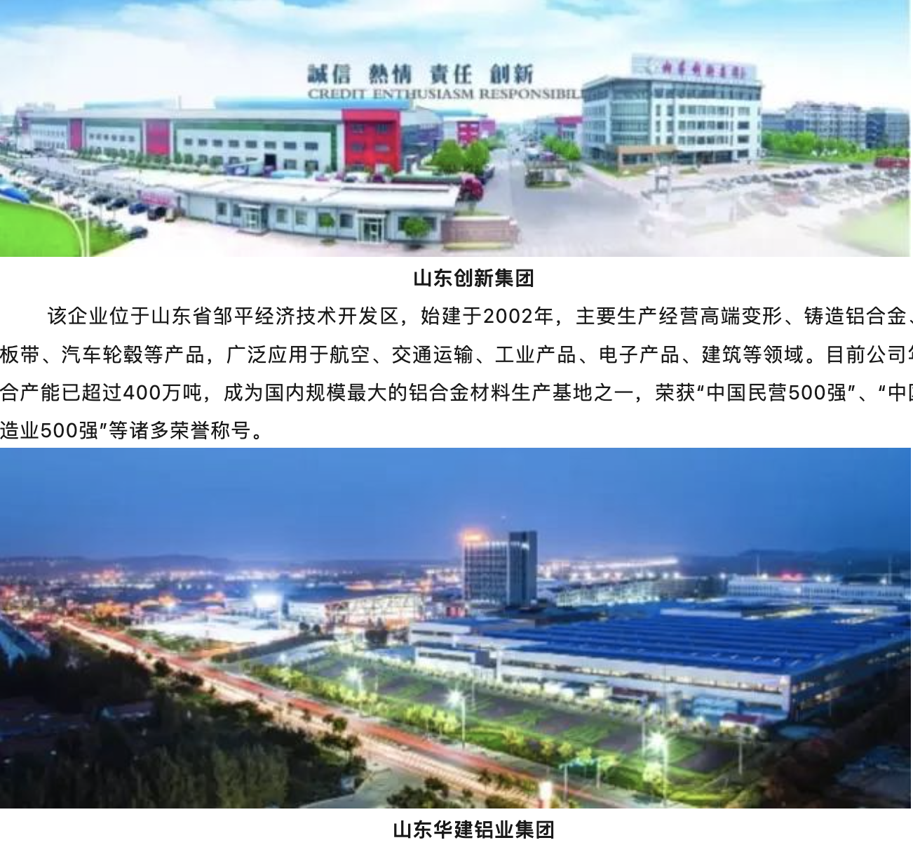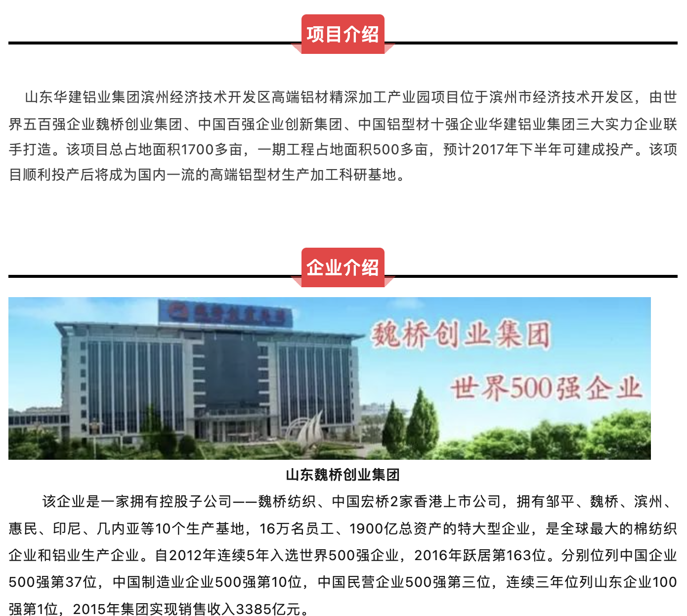 该产业园项目由世界五百强企业魏桥创业集团,中国百强企业创新集团,中国铝型材十强企业华建铝业集团三大实力企业联手打造。该项目建成后,将充分发挥三大集团的品牌优势,以及各自的资源优势,充分融合铝材上下游产业链相关环节,共同打造国内最高端的铝材精深加工产业园。